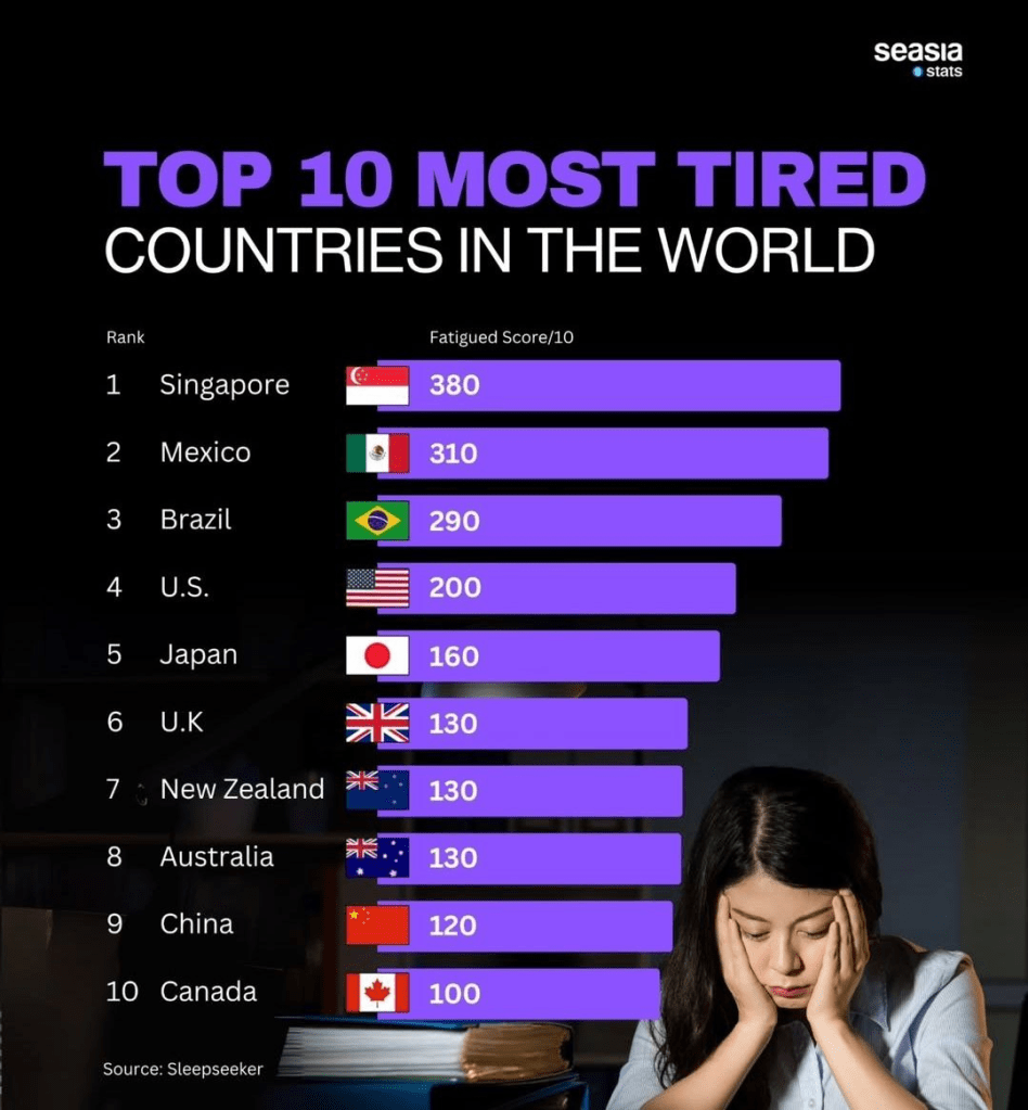 Singapore, according to Sleepseeker has been ranked number one in the world as the most sleep deprived nation on earth.